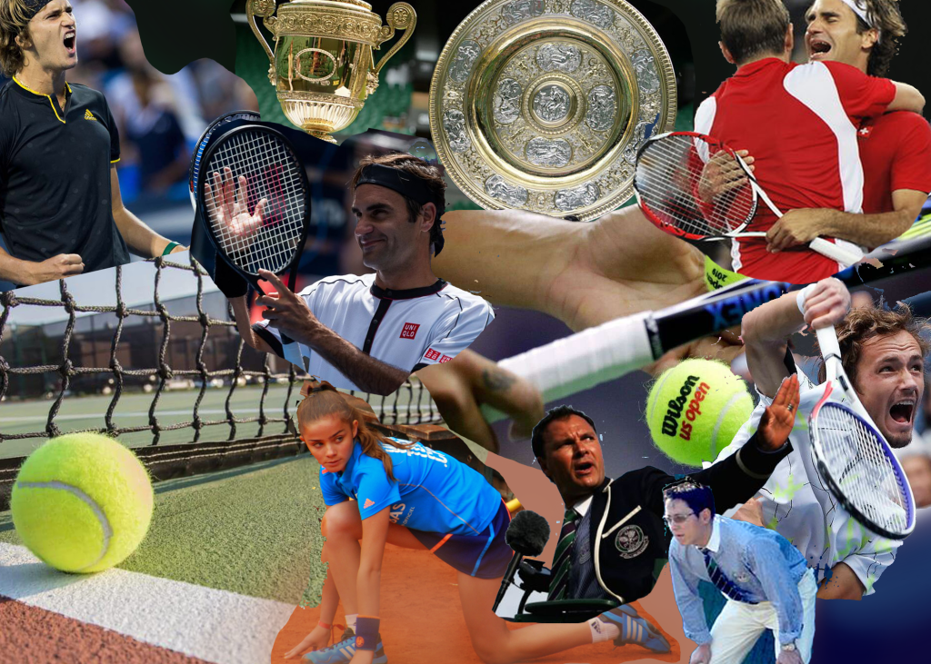 I used a lot of components referring to tennis like the racket, tennis balls, the various surfaces it is played on (grass,clay and hard court), the Wimbeldon trophy, some of the famous players and an umpire.