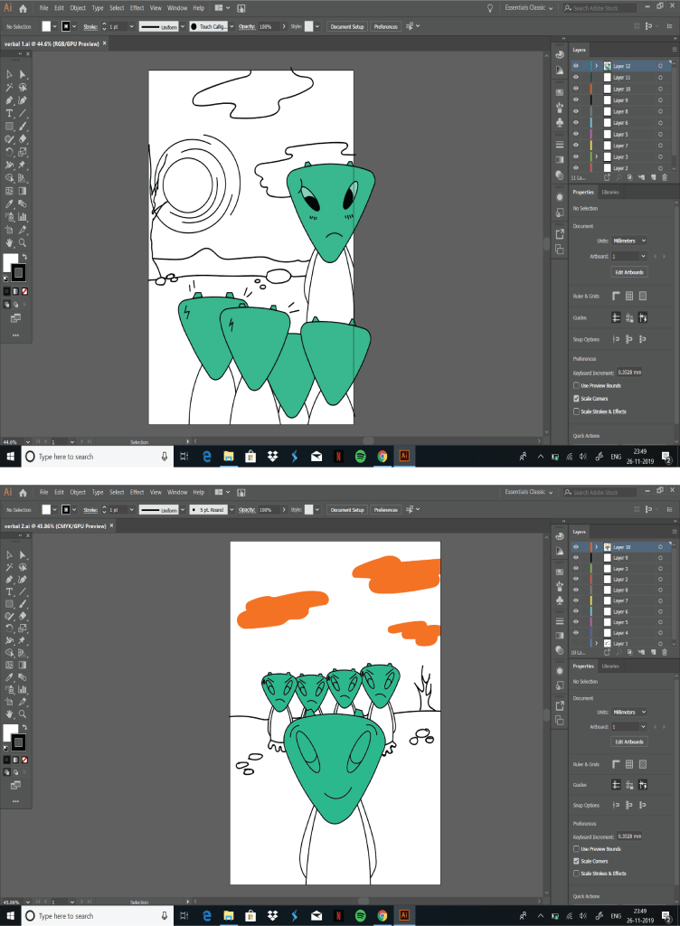 I then started making the drawings for the 6 frames and scanned them so I could use them as a guide while drawing them in illustrator.