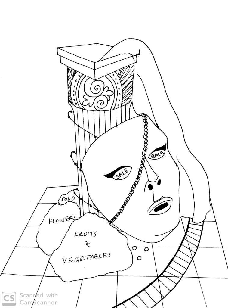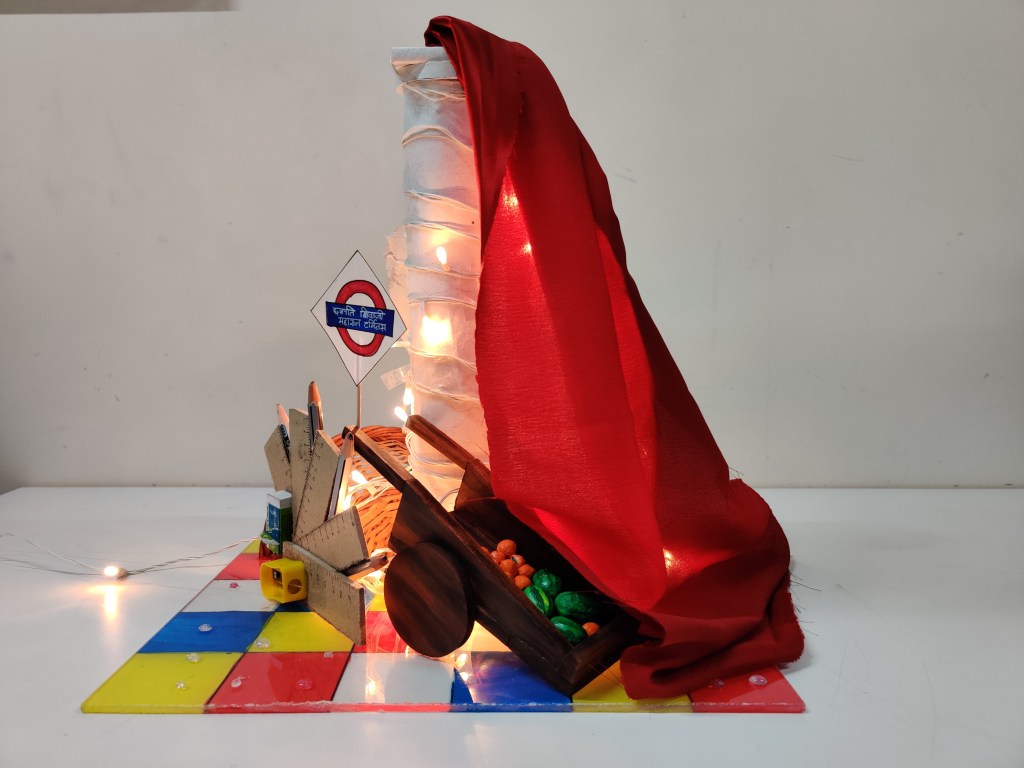 - In our model, we included various elements that represented things we saw in and around the market. Things like stationary shops, architecture, shops for fake flowers, fruits and vegetable vendors, jewellery shops and lights and hardware shops.