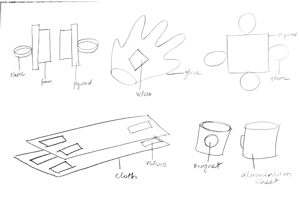 We selected quite a few materials to work with like : plywood, foam, elastic, magnets, cloth gloves, aluminium sheet, velcro and muslin cloth.