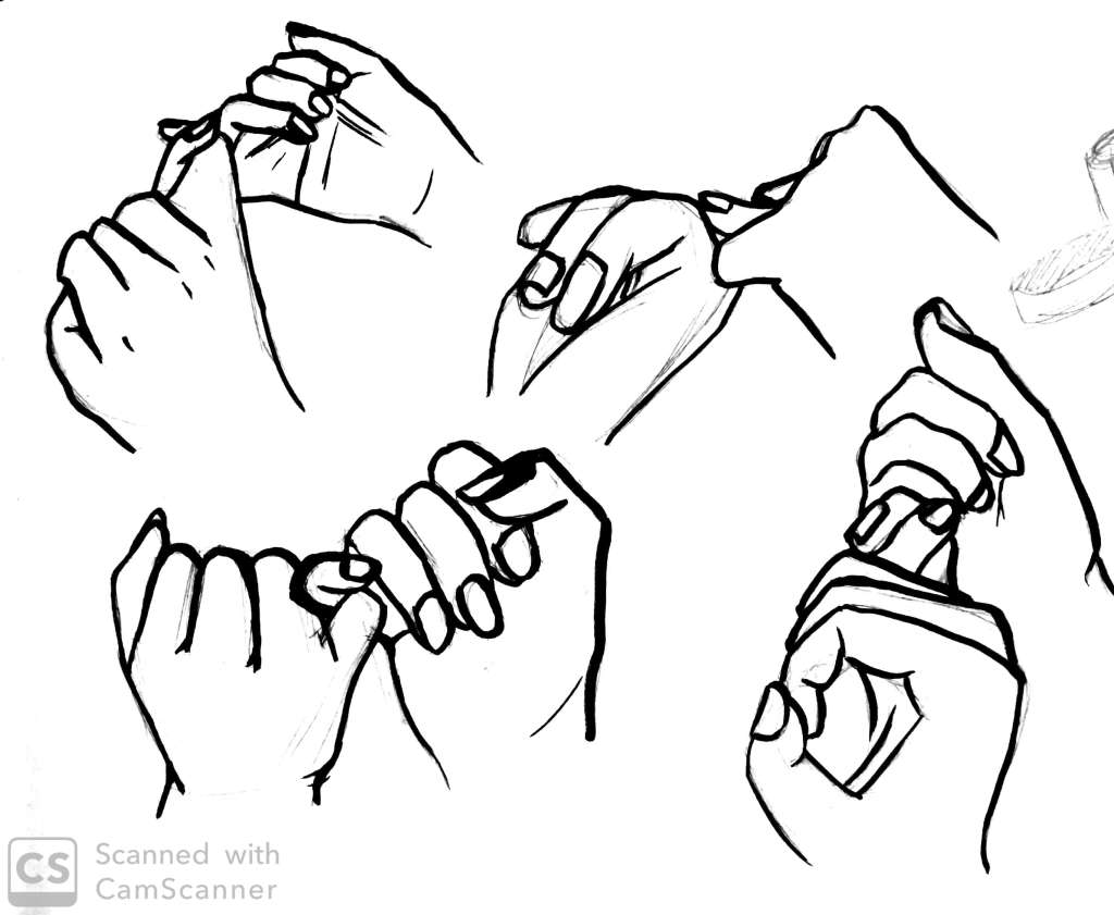 I was much more comfortable sketching hands this time than I was while working on the hand grip project. I hand more confidence in my strokes and could do them fast and easily.
