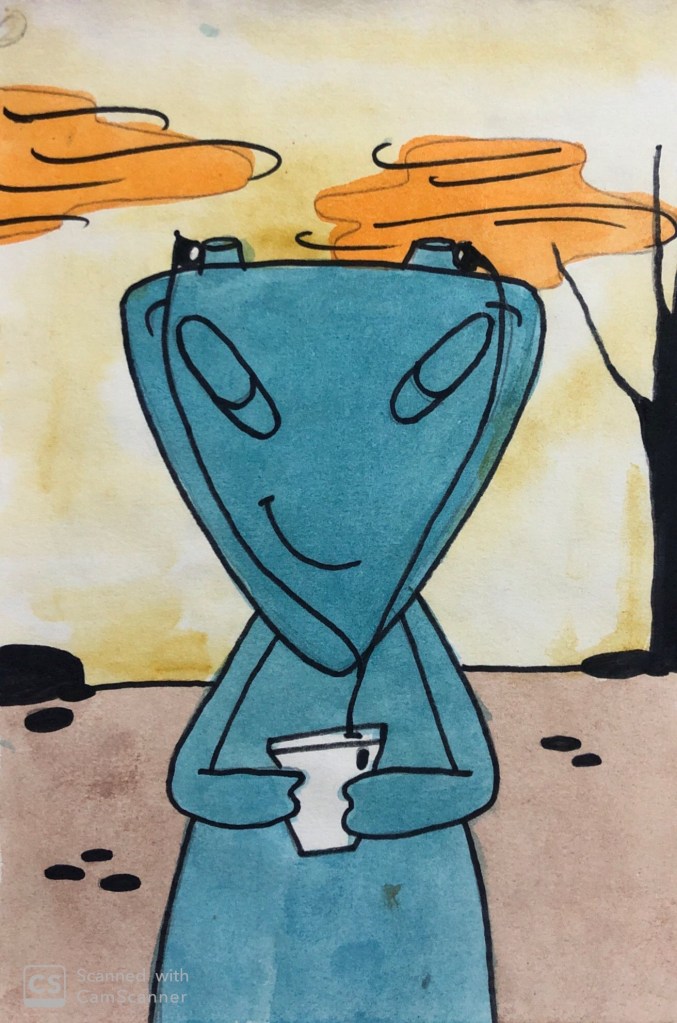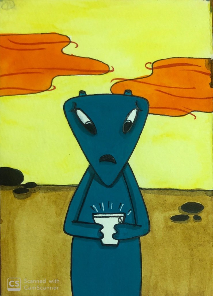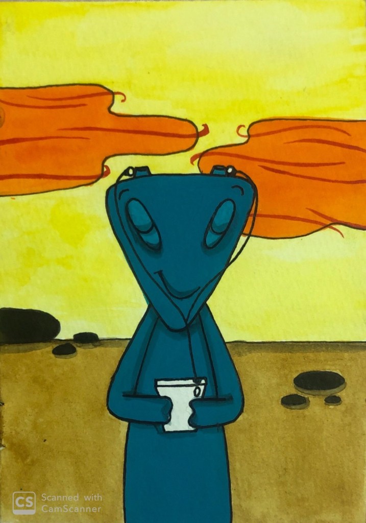 - I opted for watercolors for the background and poster colors for my character as I wanted my background to be light and the alien to stand out.