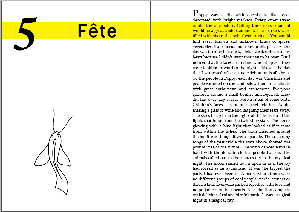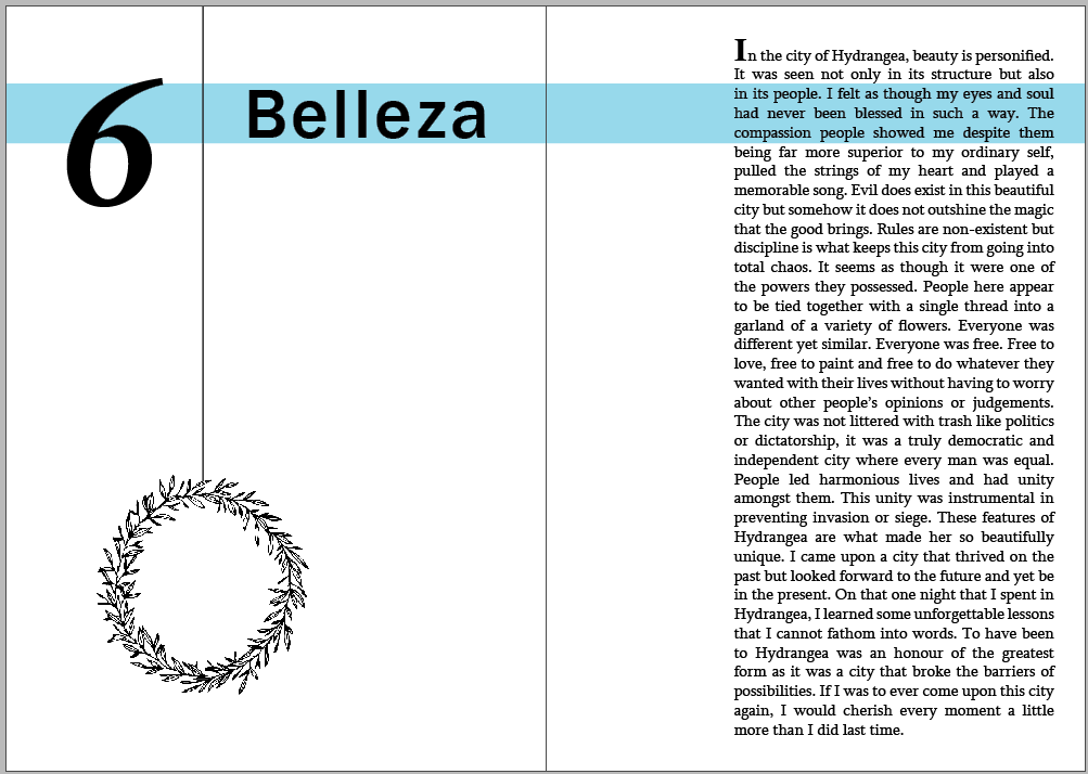 - In this week’s class I started to make layout options for my book. I then chose the one that I liked the most and started placing my chapters in that format.