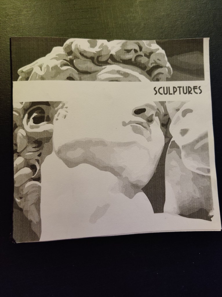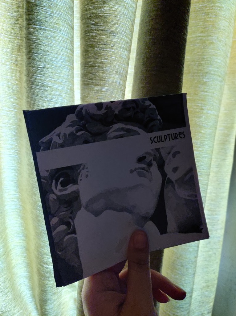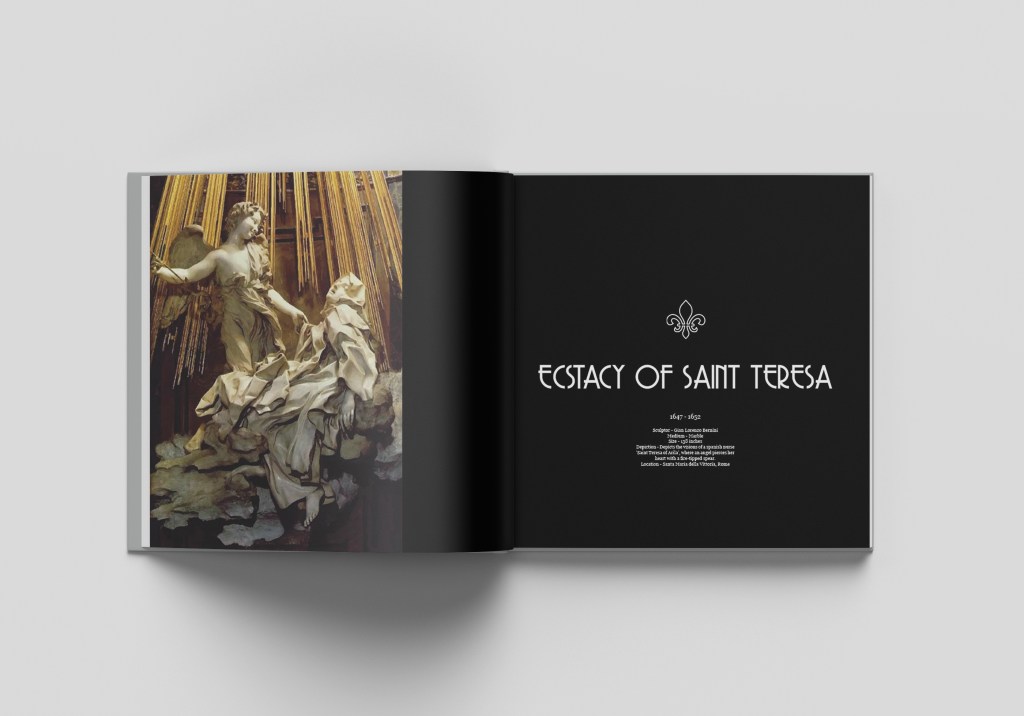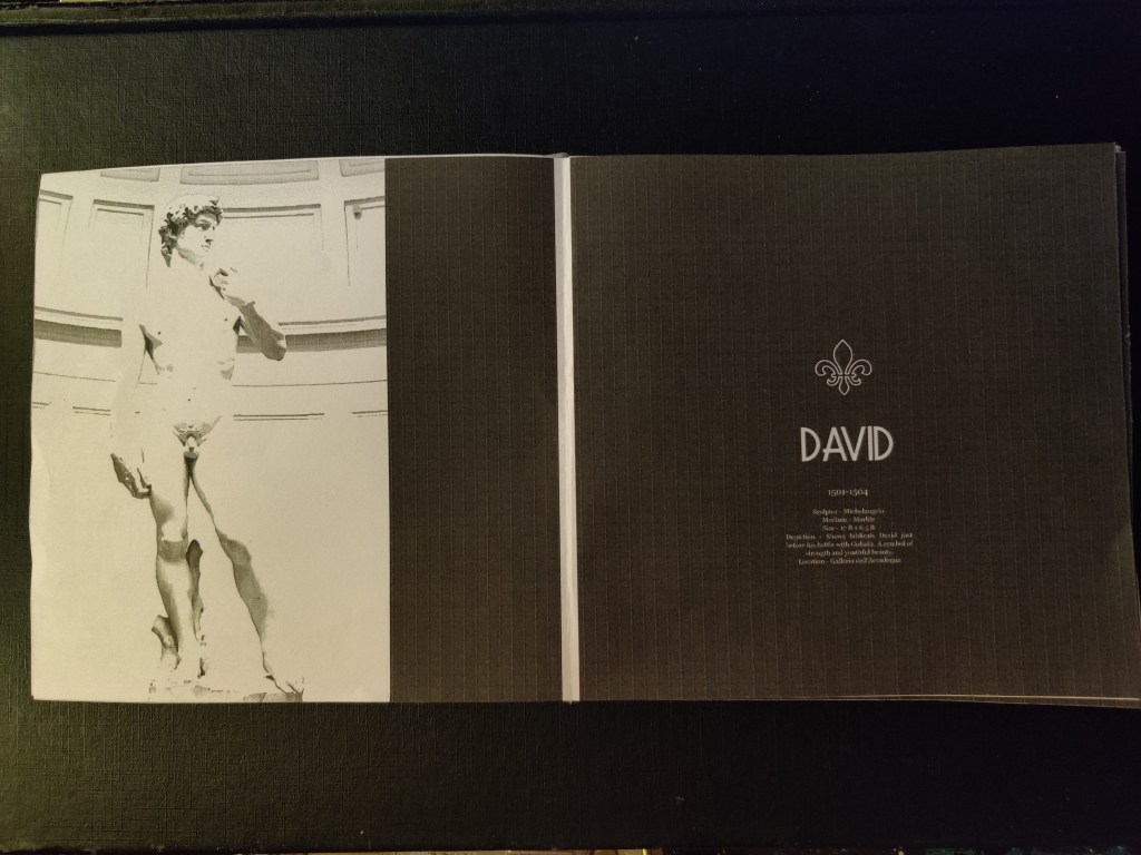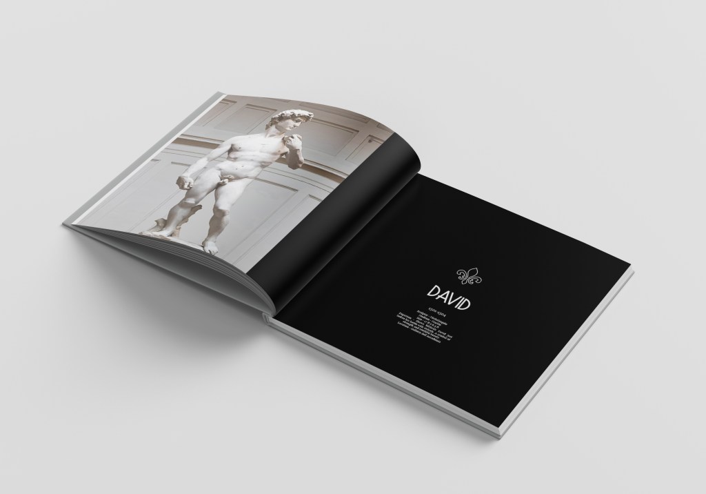 - I made a cover using a close up shot of one of the sculptures “David”. I wanted to keep it simple to match my layout.